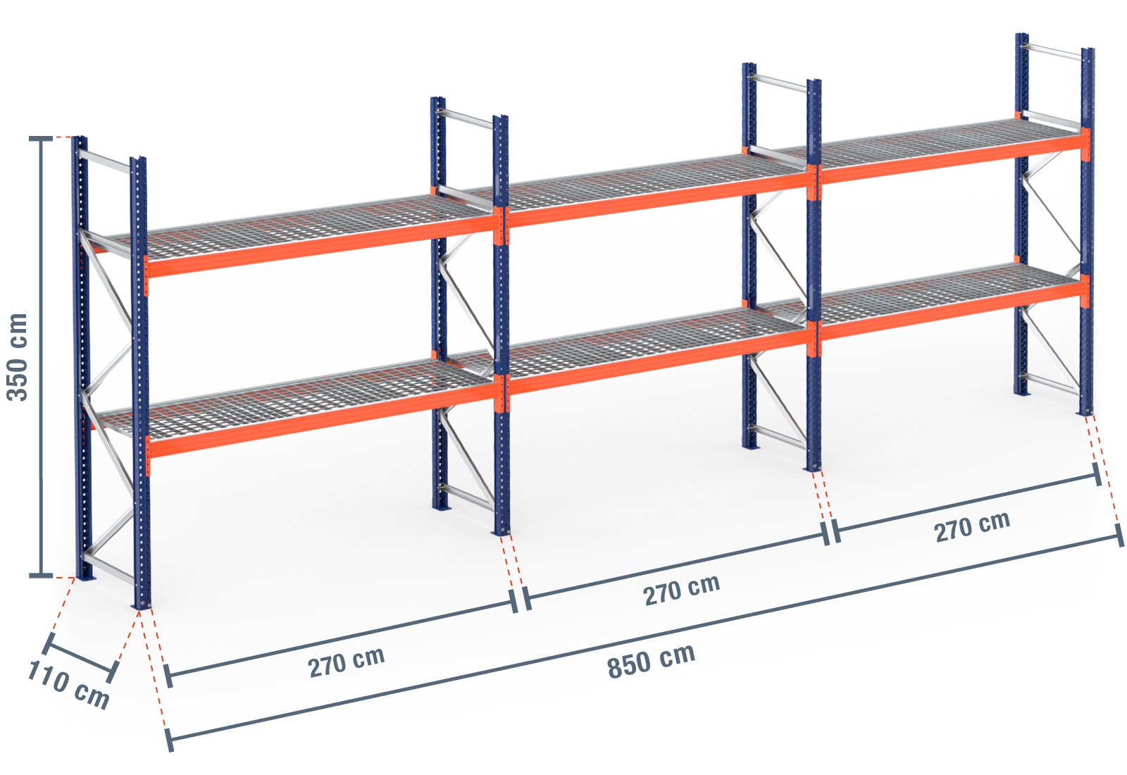 8,5 m pallhylla PR9000 / 110 cm djup / 3,5 m höjd / 2 nivåer / stöd galler