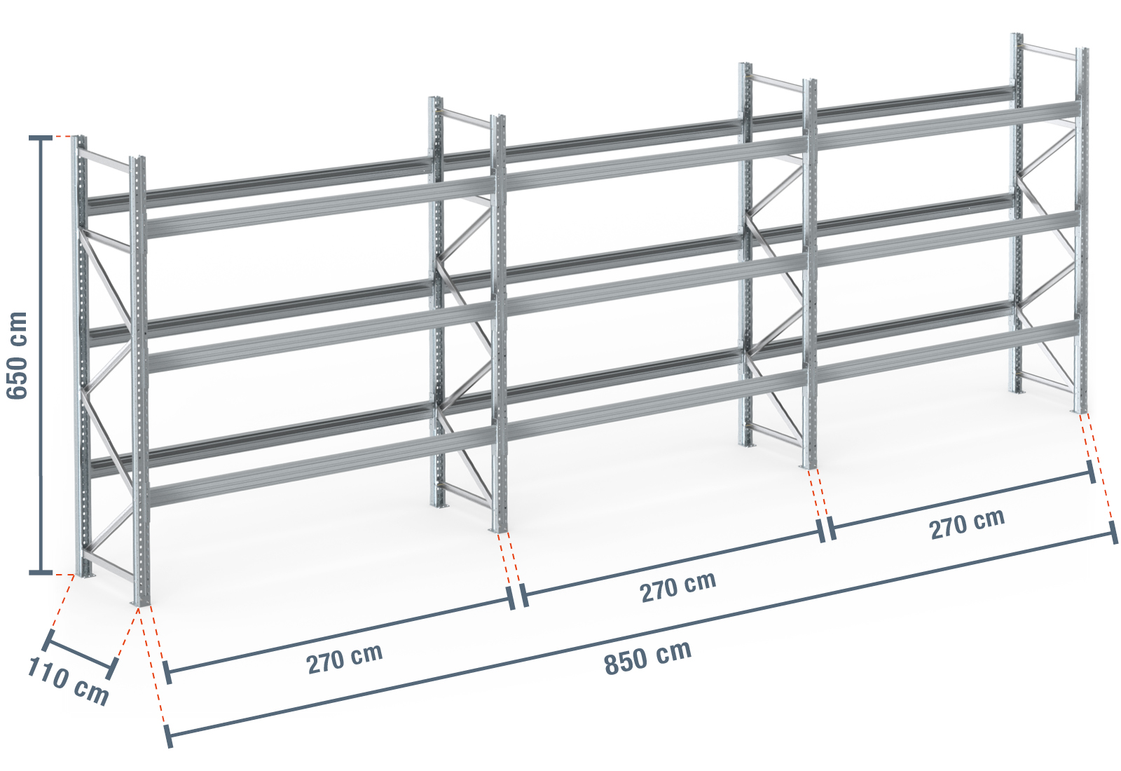 8,5 m pallhylla PR9000F varmförzinkad / 110 cm djup / 6,5 m höjd / 3 nivåer för 36 europapallar