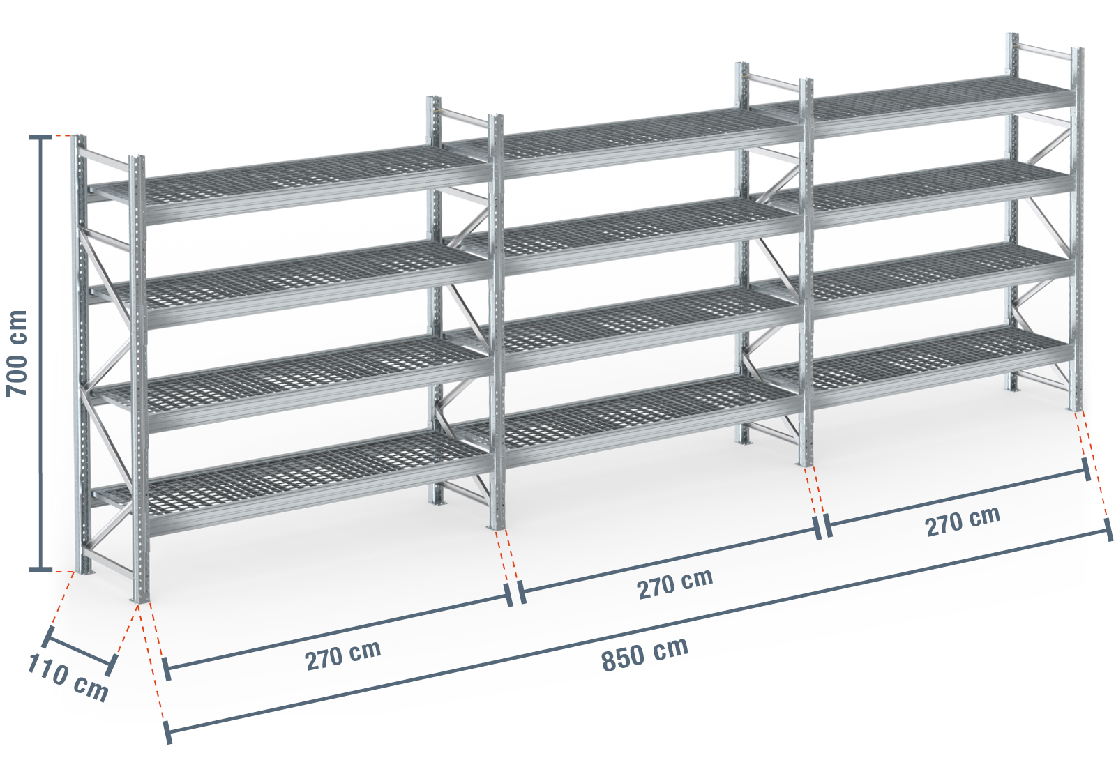 8,5 m pallhylla PR9000F varmförzinkad / 110 cm djup / 7 m höjd / 4 nivåer / stöd galler